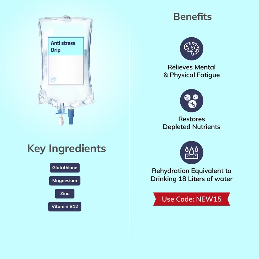 A calming Anti Stress IV treatment designed to relieve stress and recharge your body. It helps restore energy, nutrients, and hydration for both mind and body, effectively replenishing what stress depletes.