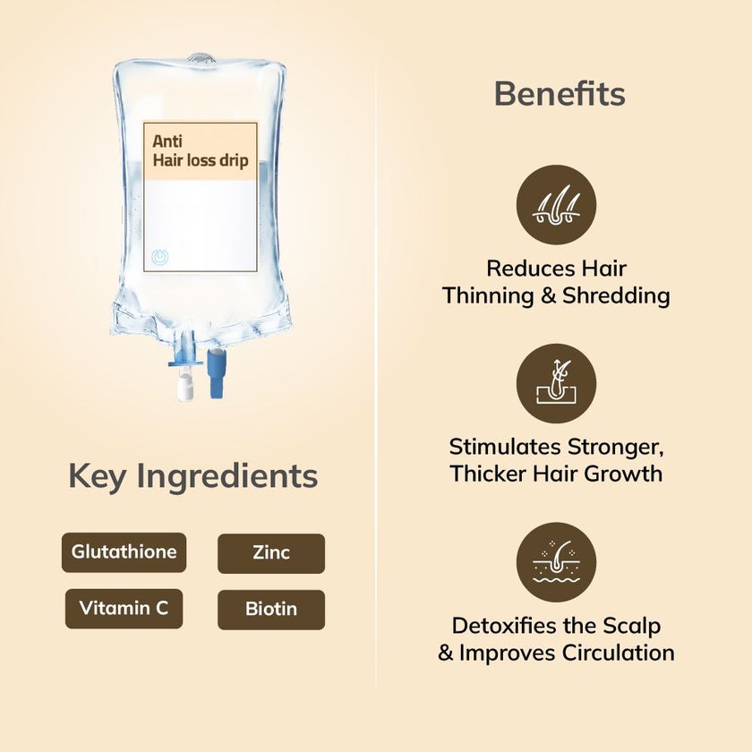 A simple Hair Restore & Growth — Anti-Hair Loss IV Drip treatment that helps reduce hair fall and promote healthier, stronger hair. It supports scalp detox, improves blood flow for better growth, and directly nourishes hair roots with essential vitamins and minerals often missing from your daily diet.
