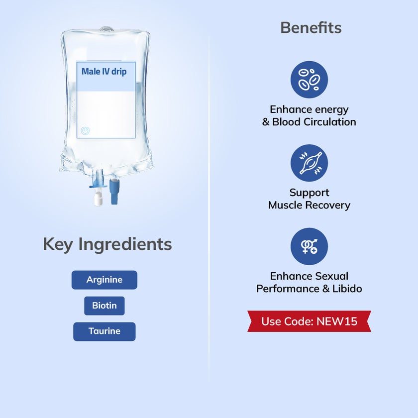 A revitalizing Men's Performance IV treatment designed to boost men’s health and performance. It helps improve energy, circulation, and overall vitality while supporting muscle recovery and sexual wellness.