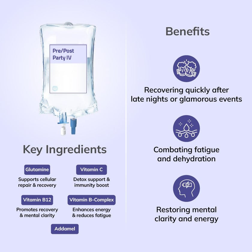 Feel refreshed fast with the Pre/Post IV, a hangover-fighting drip featuring a powerful mix of electrolytes and high-dose vitamins to restore energy and reduce nausea after late nights. Perfect for glamorous events or late-night gatherings, it helps reset your system and get you back on track.