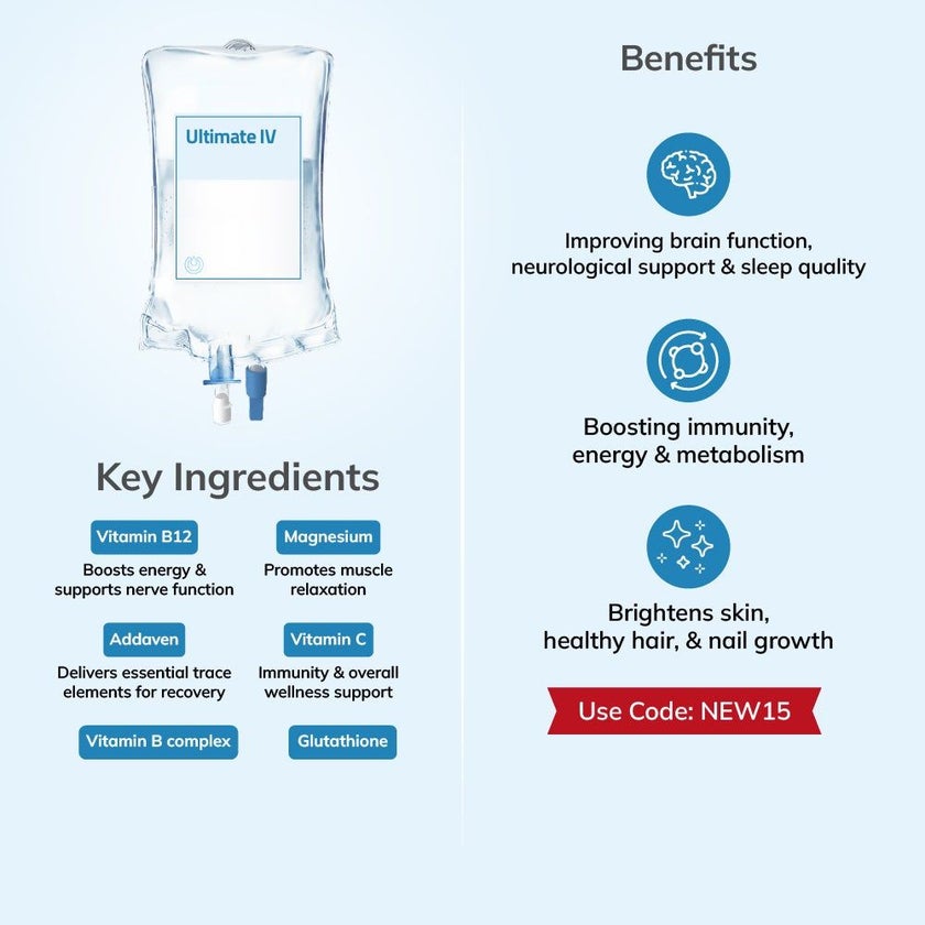 Experience full-body revitalization with the Ultimate IV (All-in-One) - 3 sessions, a powerful blend of essential vitamins, minerals, and antioxidants. Designed to boost energy, support immunity, enhance metabolism, improve bone health, and promote overall vitality and wellness, this drip delivers comprehensive benefits in 3 separate sessions.