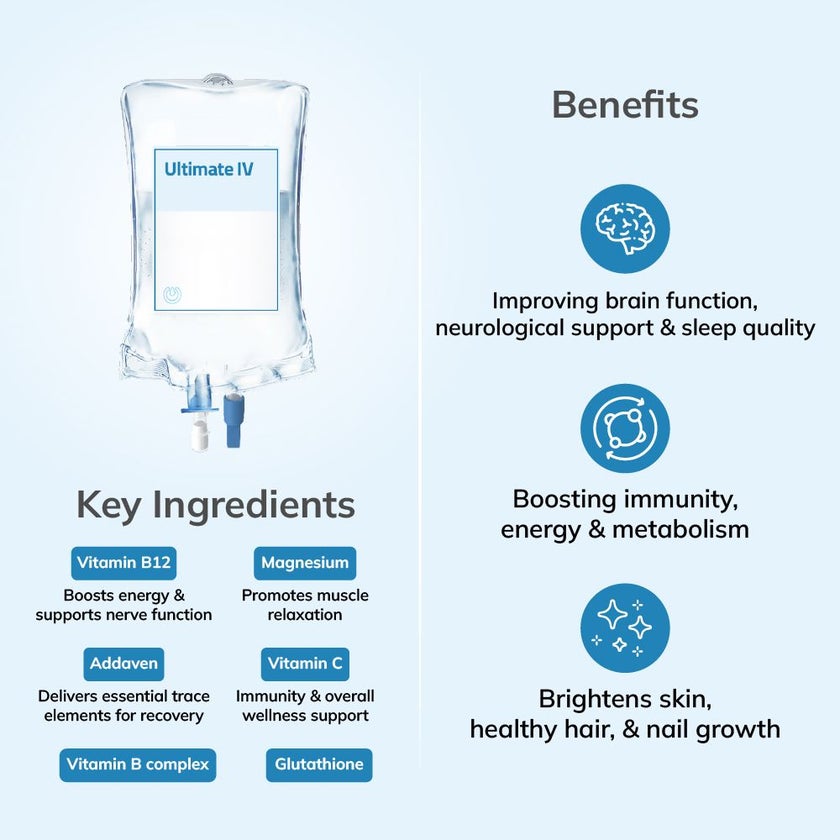 Experience full-body revitalization with the Ultimate IV (All-in-One), a powerful blend of essential vitamins, minerals, and antioxidants. Designed to boost energy, support immunity, enhance metabolism, improve bone health, and promote overall vitality and wellness, this drip delivers comprehensive benefits in a single infusion.