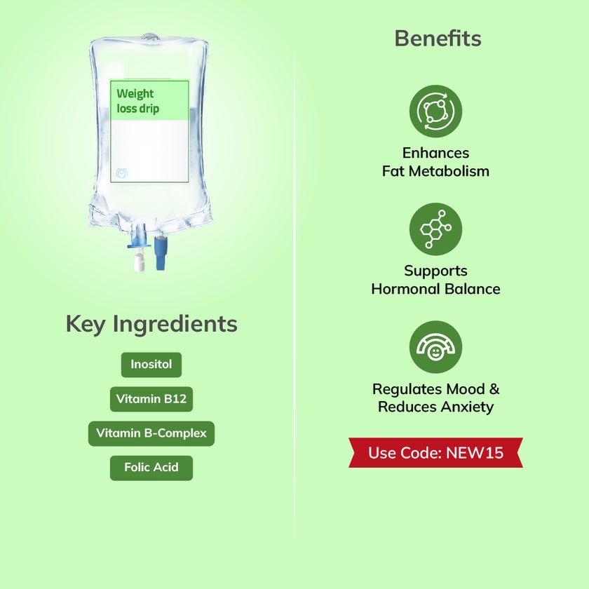 A supportive Weight Loss IV drip that helps boost fat metabolism, balance hormones, and improve overall well-being. It also aids in regulating mood and reducing anxiety during your weight management journey. This drip is suitable for pre-diabetes & PCOS.