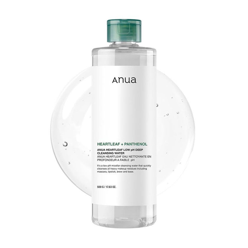 Anua Heartleaf + Panthenol Low pH Deep Cleansing Water is a gentle yet powerful makeup remover designed especially for sensitive skin. This unique cleansing water is formulated with 87% Heartleaf (Houttuynia Cordata) extract, known for its calming and soothing properties, making it ideal for delicate and irritation-prone skin. Grown in the clean region of Ulleungdo using eco-friendly methods, Anua's proprietary Heartleaf extract is at the core of this skin-loving formula. Thanks to advanced micellar technology, this cleansing water effortlessly lifts away makeup, sunscreen, and daily impurities even stubborn mascara without the need for harsh rubbing. Its fluid micellar system works deep into the pores to remove fine dust and trapped residue, delivering a truly thorough cleanse that helps promote a clearer, glass-like complexion. Formulated with a mild acidic pH of 4, it respects the skin's natural barrier and avoids disrupting its balance, making it a safe and effective option for those who want a one-step cleansing routine without oil-based products. Whether you're sensitive to double cleansing or simply prefer a lightweight option, this product delivers effective results without compromise. The formula is further enriched with plant-based squalane and panthenol, which help to hydrate and protect the skin, leaving it soft, refreshed, and free of the tightness often caused by cleansing products. These ingredients ensure your skin feels moisturized even after a deep cleanse. Free from harmful substances and tested for eye and skin irritation, this Deep Cleansing Water is a dependable choice for anyone looking to gently cleanse while maintaining a healthy, soothed, and hydrated complexion. It's your go-to solution for effective, non-stripping cleansing that's suitable for everyday use even on sensitive skin.