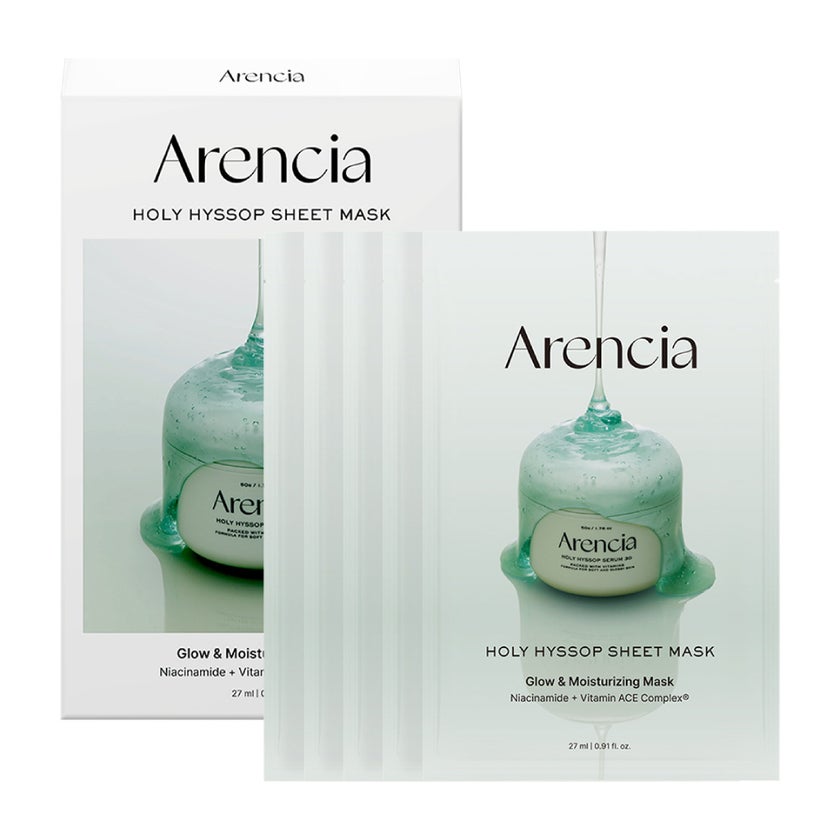 Arencia Holy Hyssop Sheet Masks are a luxurious skincare solution designed to deliver instant hydration, repair, and radiance to your complexion. Each sheet mask is infused with a potent blend of Vitamin ACE, flaxseed extract, and French hyssop, combining nourishment, antioxidants, and soothing properties to revitalize tired or dull skin. These masks are crafted to provide a spa-like experience at home while delivering visible results in just one application. Vitamin ACE, a combination of vitamins A, C, and E, helps protect the skin from environmental stressors, brightens the complexion, and supports overall skin health. Flaxseed extract contributes deep hydration and aids in repairing the skin barrier, leaving your skin feeling supple and rejuvenated. French hyssop works as a natural antioxidant and soothing agent, calming irritation while promoting a healthy, refreshed glow. The masks are designed for daily or occasional use, depending on your skin's needs, and adhere comfortably to the contours of your face for maximum absorption. With consistent use, skin appears visibly smoother, plumper, and more radiant, with improved texture and elasticity. The sheet masks' lightweight, serum-soaked material ensures that nutrients are delivered efficiently without feeling heavy or sticky. Arencia Holy Hyssop Sheet Masks are suitable for all skin types, including sensitive skin, providing gentle yet effective care. Each pack contains individually wrapped masks, making it easy to incorporate into your self-care routine. Indulge in these masks to experience a spa-like treatment at home, leaving your skin hydrated, luminous, and rejuvenated. Transform your skincare routine with Arencia's Holy Hyssop collection and reveal soft, glowing, and healthy-looking skin.