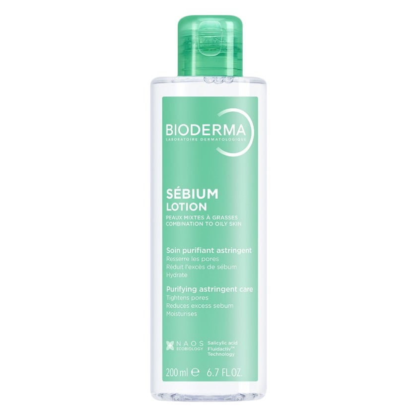 Bioderma Sebium Lotion durably rebalances sensitive combination or oily skin. Triple action: 8-hour hydration, regulation of sebum and skin's pH. It tightens pores. Non comedogenic.