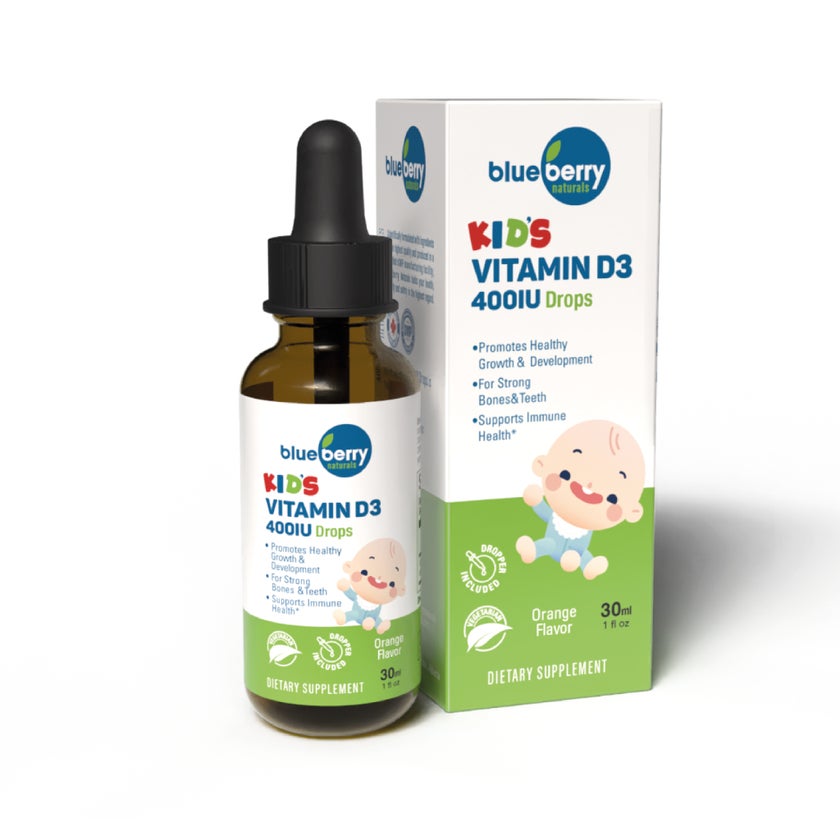 Blueberry Naturals Kid's Vitamin D3 400IU Oral Drops designed to support your child's healthy growth. Specially formulated for infants and children, these easy-to-administer drops provide an essential daily dose of Vitamin D3 to aid calcium absorption and promote strong bones and teeth. Vitamin D3, also known as cholecalciferol, plays a crucial role in supporting the healthy development of bones, teeth, and the immune system. It's especially important for children, who are in their peak stages of growth and development. In many regions, especially where sun exposure is limited, dietary supplementation becomes necessary to maintain healthy vitamin D levels. Breast milk is naturally low in vitamin D. This formula is suspended in pure sunflower seed oil, a gentle and natural carrier that ensures optimal absorption and bioavailability. Free from unnecessary additives, artificial flavors, or preservatives, these drops are ideal for even the most sensitive tummies. The liquid format ensures convenient use, especially for young kids who have difficulty swallowing tablets. With a gentle and safe formula, it helps boost immunity and overall development, making it an essential addition to your child's daily routine. Designed with busy parents and picky kids in mind, our drops are in orange flavour, easy to administer, and suitable for infants and children of all ages. The included dropper makes dosing simple and accurate, whether added to food, drink, or given directly by mouth.