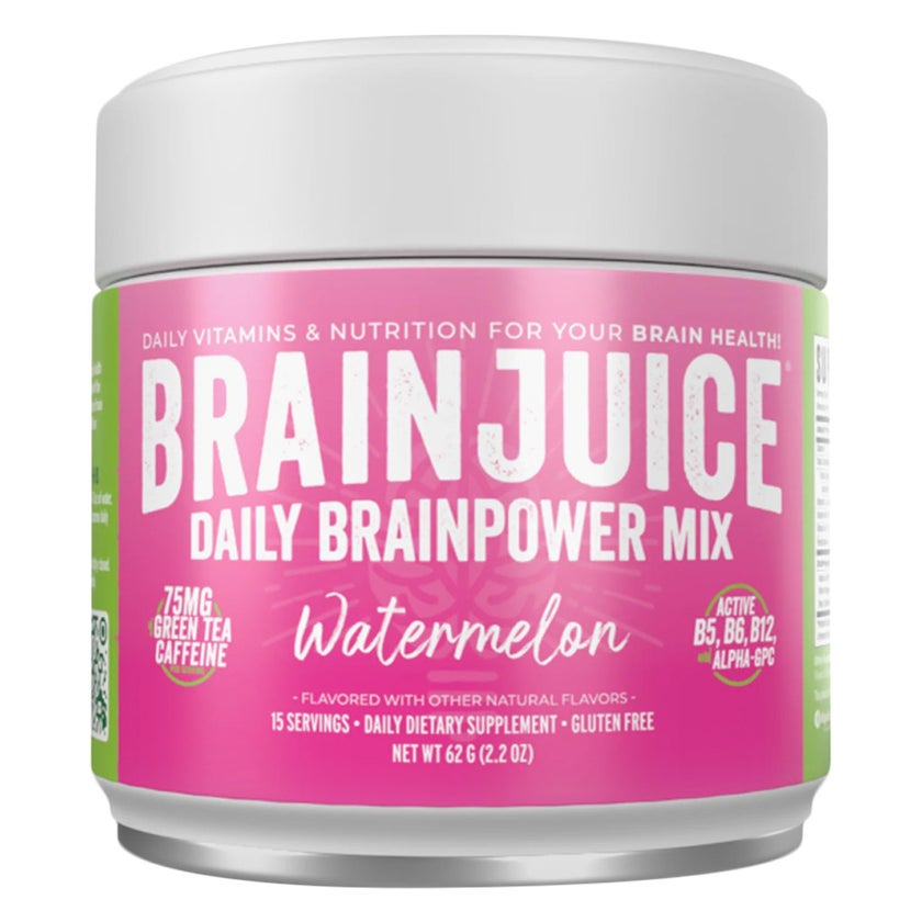 Brainjuice Daily Power Mix Watermelon Powder is a functional cognitive wellness drink designed to help you stay sharp, focused, and mentally energized throughout your day. Each serving delivers 75mg of caffeine paired with green tea extract, offering a clean and sustained boost in alertness while also supplying antioxidant support for overall brain health. The formula is further enriched with a targeted blend of Vitamin B5, B6, and B12, essential micronutrients that contribute to normal energy metabolism and help support the nervous system during mentally demanding tasks. To further elevate cognitive performance, this watermelon brain drink includes Alpha-GPC, a premium choline source known to support memory, concentration, and healthy neurotransmitter activity. Together, these brain-supporting ingredients help improve mental clarity, productivity, mood, and motivation, making it ideal for busy professionals, students, creatives, and anyone seeking science-backed daily cognitive support. Simply mix one scoop into water or your favorite beverage for a refreshing watermelon brain boost that fits seamlessly into your routine, helping you feel energized, focused, and mentally clear whenever you need it most.