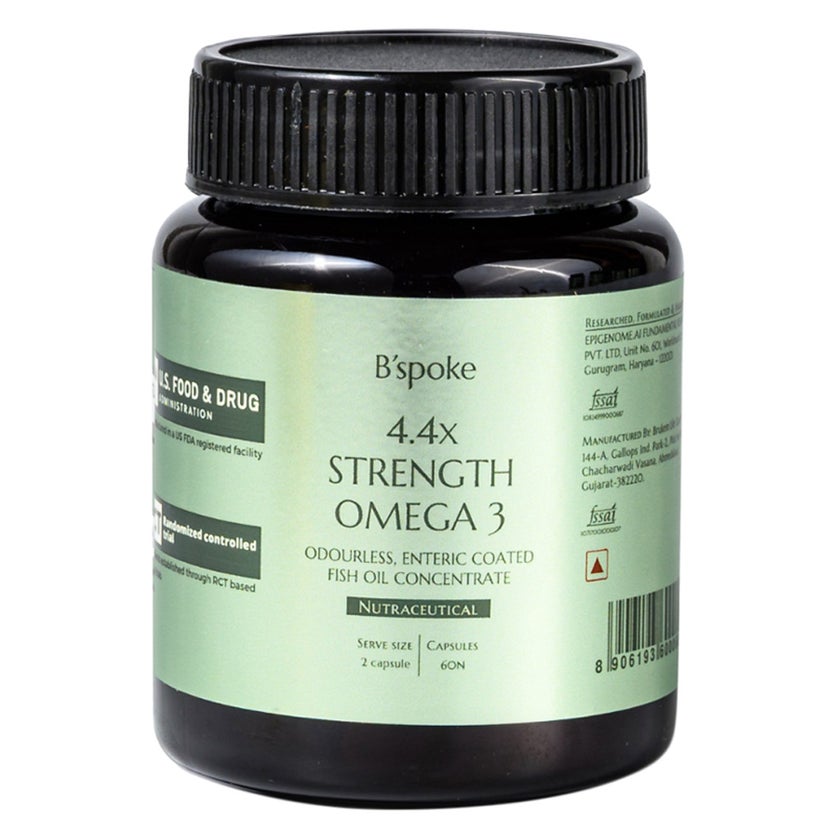 B'spoke 4.4X Strength Omega 3 Fish Oil Capsules are high potency supplement designed to support heart brain and joint health through a concentrated dose of essential omega 3 fatty acids. This advanced formula delivers a powerful combination of EPA and DHA with 40% EPA and 30% DHA helping to maintain healthy cholesterol levels and support overall cardiovascular function. It works to promote mental clarity focus and cognitive performance while also supporting joint comfort and mobility for everyday wellbeing. The enteric coated softgels are specially designed to protect the nutrients from stomach acids ensuring better absorption and targeted release in the intestines for maximum effectiveness. Enriched with vitamin E the formula also provides antioxidant support helping to protect cells from oxidative stress and maintain overall health balance. With regular use it helps improve skin hydration support inflammation balance and enhance overall vitality. Easy to swallow and convenient for daily use this supplement is ideal for those looking to maintain a healthy lifestyle and support long term wellness.