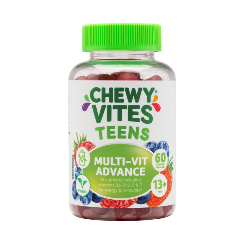 Chewy Vites Teens Multi Vitamin Advance Gummies are specially formulated daily supplements designed to support the nutritional needs of teenagers. Each gummy delivers a blend of 15 essential vitamins and minerals including vitamins B6 B12 C and D to help maintain energy levels and support normal immune function. Made with real fruit juice and a natural berry flavour these vegan gummies provide a convenient and enjoyable way for teens to maintain balanced nutrition. Ideal for boys and girls aged 12 to 19 this two month supply helps support daily wellbeing energy metabolism and overall health.
