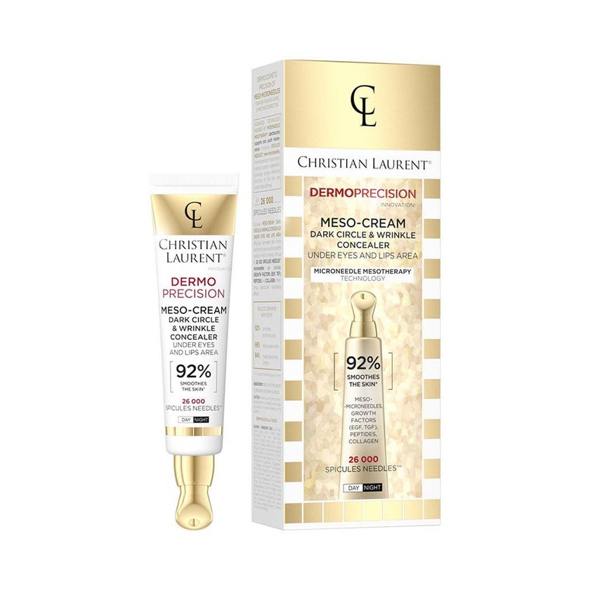 Christian Laurent Dark Circle & Wrinkle Concealer Meso-Cream is a luxurious, high-performance treatment designed for the demanding and delicate skin around the eyes and mouth, the first areas to show visible signs of ageing, dryness, and fatigue. This advanced formula not only reduces wrinkles and expression lines but also lightens dark circles, restores firmness, and remodels facial contours for a fresher, more youthful appearance. At the heart of its innovation lies 26,000 Spicules Needles microneedles per tube, made from natural silica, which act as microstimulators to boost circulation, deliver active ingredients deep into the skin, and activate cellular repair processes. Clinical studies show outstanding results: 92% of women experienced smoother, more hydrated skin, 88% saw lighter dark circles, and 84% reported firmer skin around the eyes and mouth. Enriched with a potent peptide complex (tri-, tetra-, and hexapeptides) to fight wrinkles and slow skin ageing, collagen to strengthen and improve elasticity, shea butter and betaine for deep hydration and nourishment, and soy and wheat proteins to smooth and firm, this cream delivers both instant and long-term results. Folic acid ferment boosts cell renewal and collagen production, while gold particles add radiance, improve microcirculation, and revitalize tired skin. The formula is complemented by a special cooling applicator, which massages gently, stimulates circulation, and enhances absorption for maximum effectiveness. With regular use, skin becomes visibly smoother, firmer, and brighter, regaining resilience and youthful vitality. This cream is your everyday luxury ritual, offering the effectiveness of professional salon treatments, without invasive procedures.