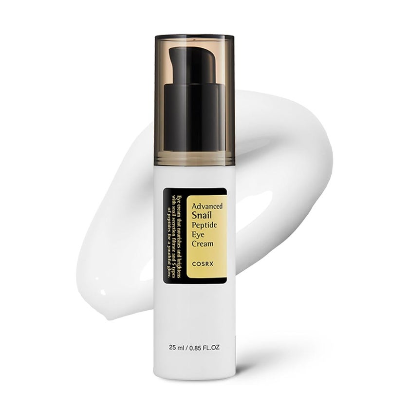 Cosrx Advanced Snail Peptide Eye Cream is non- heavy, double-functioning eye cream that visibly brightens the eye area. Hydrating, fast absorbing eye cream for EVERYONE - 20s, 30s, 70s, even teens - without over nourishment. Promote the appearance of brightness with COSRX’s Advanced Snail Peptide eye cream. The smooth, lightweight cream glides effortlessly across your skin, absorbing fast to avoid any heavy, sticky residue being left behind. The double-functioning formula works to encourage the illusion of radiance and luminosity, minimizing the look of dark circles and discoloration. 72% Snail Secretion filtrate, along with 5 Peptides and Niacinamide, help you to achieve the look of plumper, firmer-looking under-eye skin, reducing the appearance of fine lines and wrinkles. The non sticky texture is perfect for all skin types. It absorbs in instantly and tightens. Perfect for the sensitive eye area, care for your eyes with this not irritating cream.