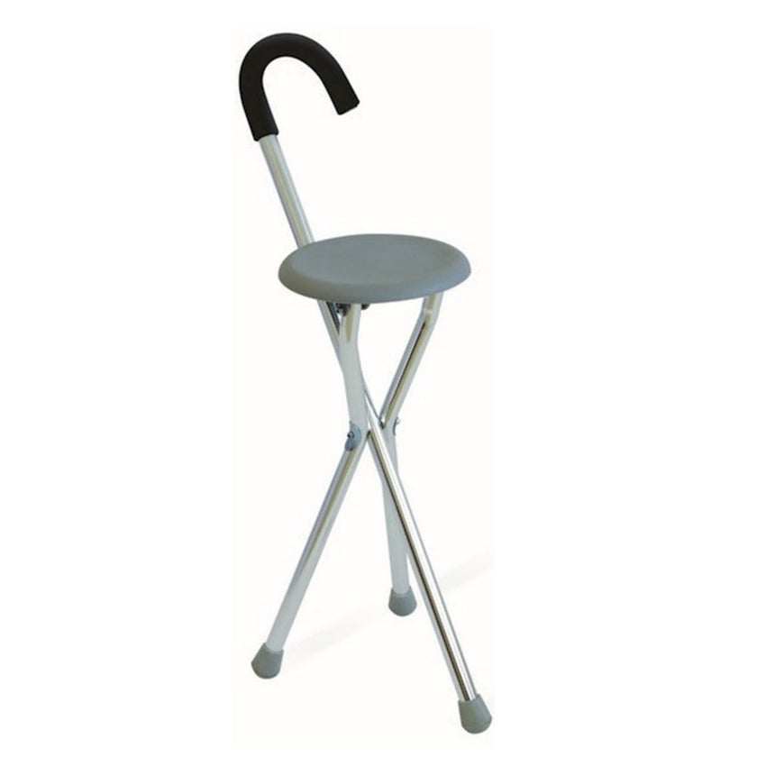 Dayang Walking Stick With Seater features a comfortable, curved foam handle, with a folding seat integrated into the frame. Manufactured from aluminium with a robust, plastic seat and non-slip feet, the tripod-style seat is suitable for users up to 100 kg in weight. The seat is well screwed with 3 legs. It would be very secured and safe. When the seat is not needed, it could be folded, to become a normal stick. With the 3 legs, there is rubber tips to extend durability. The handgrip is wild, offering comfort for the users. The weight of the tripod cane with seat is only 0.9kg, so it is comparably light due to the aluminium material.