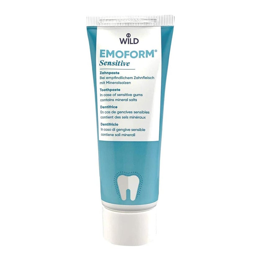 Emoform® Sensitive Toothpaste rapidly protects and soothes sensitive teeth and exposed tooth necks by building a protective barrier against the pain caused by sensitive teeth by blocking the nerve channels which transmit pain. It contains fluoride, which protects against dental caries, and natural mineral salts, which stimulate salivation to promote physiological self-cleaning of the mouth and contribute to the maintenance of healthy gums. It has a medium abrasively for safe, optimal cleaning and naturally white teeth.