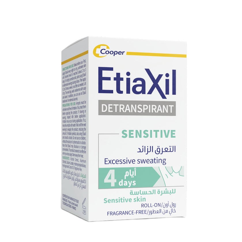 Etiaxil Détranspirant 4-Days Sensitive Underarm Excessive Sweating Roll-On is a clinically proven solution developed to control excessive underarm sweating while being gentle on sensitive skin. Its concentrated formula acts directly on the sweat glands to provide up to 4 days of dryness and odor protection with each application. Enriched with the CPX Complex, it helps balance the skin’s pH level, protect the skin barrier, and minimize irritation—making it ideal for first-time users or those prone to sensitivity. The fragrance-free, dermatologically tested formula ensures long-lasting comfort without leaving white marks, yellow stains, or sticky residue. Compact and travel-friendly, this precise roll-on provides professional-grade sweat protection trusted by dermatologists and pharmacies worldwide. Made in France, Etiaxil offers the confidence of lasting dryness and freshness with minimal effort.