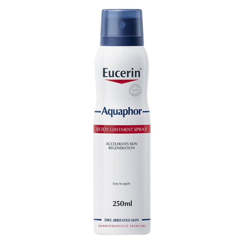 Eucerin Aquaphor Body Ointment Spray is specially formulated to give dry to very dry, rough and irritated skin the SOS care it needs. This water-free ointment's potent formula consists of Bisabolol that works as an anti-irritant and anti-inflammatory agent to soothe dry and irritated skin. Panthenol helps speed up skin regeneration and repair while also moisturizing the skin. Lastly, Glycerin is an effective moisturizer that attracts water and retains it in the skin for long-lasting hydration. Together, the effectiveness of each of these ingredients work to target dryness and roughness. Skin works hard to protect our bodies, but it can become very dry, cracked and irritated as a result. It needs SOS care. This is why, we created the Aquaphor range to provide relief to dry, cracked and irritated skin. This body ointment comes in an innovative 360° nozzle spray bottle which is convenient to use; it helps spread moisturizer easily on arms, legs and other large parts of the body. The body spray, however, is not to be used on face. The body spray is free of preservatives and fragrance, making it gentle on skin. It is clinically proven to show very good efficacy and skin tolerability on very dry, rough and irritated skin. About 90% of our respondents from the clinical trial confirm that the ointment immediately soothes and relieves dry and rough skin all day.