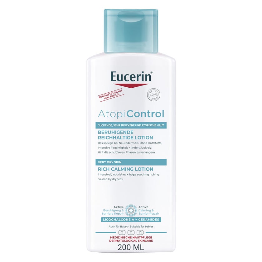 Eucerin AtopiControl Rich Calming Body Lotion is an easily absorbed and water-in-oil lotion that helps hydrate, soothe and reduce skin discomfort and dryness caused by atopic dermatitis. Its rich formula contains essential ingredients that ease itchy and dry skin. Licochalcone A actively soothes and calms inflammations, Natural Omega Oils help stabilize skin's natural protective barrier, and Ceramides strengthen skin's barrier to prevent moisture loss. If you have dry and irritable skin, Eucerin AtopiControl range is a perfect solution during inactive phases as well as when flare-ups occur. Experience intense moisturization, improved skin condition and a visibly smooth skin with daily and regular application of Eucerin AtopiControl Rich Calming Body Lotion. It's a perfect body lotion for dry skin that can be used once or twice daily or as adjunctive care to Eucerin AtopiControl Acute Care Cream during a flare-up. It is suitable for adults, children, and babies that are three months or over. To minimize the risk of skin irritation, Eucerin AtopiControl Body Lotion is made without harsh chemicals. It contains no fragrance, parabens and colorants, making it safe and gentle for use on newborn and fragile skin as well. The body lotion is clinically and dermatologically proven to be suitable for patients with atopic skin.
