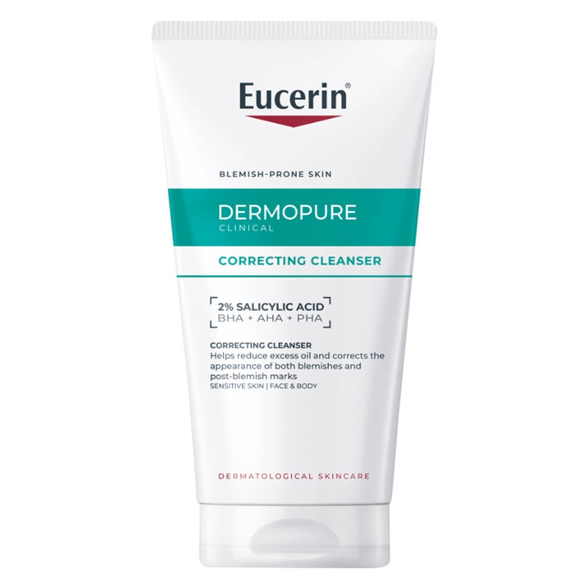 Eucerin Dermopure 2% Salicylic Acid Correcting Cleanser is a clinically advanced cleansing gel designed to target acne, excess oil, and post-acne marks in one effective step. Unlike basic cleansers that only remove surface impurities, this formula works deeper within the skin thanks to its serum-level concentration of active ingredients, making it a powerful solution for blemish-prone and problematic skin. At the core of its formulation is 2% Salicylic Acid (BHA), a highly effective exfoliating ingredient known for its ability to penetrate deep into pores, dissolve excess sebum, and prevent clogging. This helps reduce blackheads, whiteheads, and active breakouts while minimizing the chances of future acne formation. In addition, the formula includes an AHA and PHA complex, which gently exfoliates the skin’s surface, removes dead skin cells, and promotes cell renewal resulting in smoother, clearer, and more even-toned skin. This triple-action approach not only targets active blemishes but also helps fade post-acne marks (hyperpigmentation), a common concern for acne-prone individuals. By improving skin turnover and reducing discoloration, it supports a more refined and balanced complexion over time. Despite its powerful exfoliating action, the cleanser is formulated to be gentle and non-stripping, ensuring that the skin’s natural barrier remains intact. It effectively removes dirt, oil, and impurities without causing dryness or irritation, making it suitable even for sensitive skin types. Its lightweight gel texture creates a refreshing cleanse, leaving the skin feeling purified, smooth, and comfortable after each use.