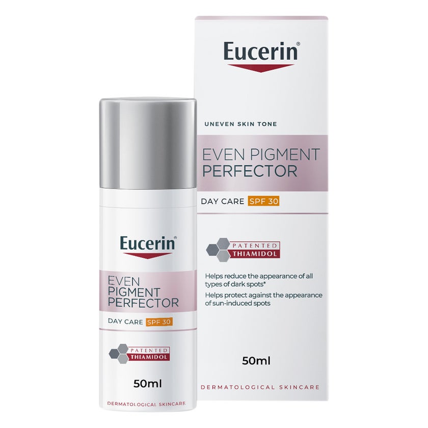 Eucerin Even Pigment Perfector SPF30 Day Cream is developed to help reduce all types of dark spots and hyperpigmentation caused by sunlight exposure, hormonal influences, acne and aging. Thiamidol acts at the root cause of hyperpigmentation by reducing melanin production from day 1. This lightweight, non-greasy and fast-absorbing formula is suitable for all skin types and tones. Enriched with SPF 30, it protects against UVA and UVB rays and helps prevent sun-induced pigment spots. Clinically and dermatologically proven, participants reported 98% spot reduction success when used regularly.