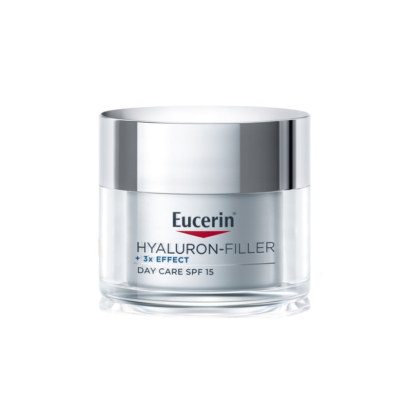 Eucerin Hyaluron Filler Anti-Aging Face Day Cream for Dry Skin with 3x Effect contains Hyaluronic Acid that helps you achieve younger looking skin by plumping up even the deepest wrinkles for a rejuvenated look. It also provides protection against premature signs of aging. Its advanced formula also contains Glycine Saponin to help stimulate production of Hyaluronic Acid in the dermal layer of the skin, while Enoxolone helps improve skin texture to minimize signs of aging. Its rich, yet fast-absorbing formula is ideal for dry skin, leaving the complexion smoother, rejuvenated, and radiant. Additionally, this anti-aging day cream has been enriched with SPF 15 to help skin defend against UVA and UVB rays, shielding the skin from harmful UV rays that contribute to premature ageing and deepening of wrinkles. The face cream also works as a great makeup base. It's clinically and dermatologically proven to show very good results on dry skin and is suitable for all skin types. Eucerin Hyaluron-Filler Day Cream SPF 15 is an anti-ageing face moisturiser for dry skin, formulated with a unique 3x Effect formula to target and visibly reduce fine lines and deep wrinkles. Different aspects of our lifestyles, including sun exposure, pollution, and smoking, can trigger the formation of free radicals, which can expedite premature skin aging and leave skin looking dull. The Hyaluron Filler range is developed to address these concerns.