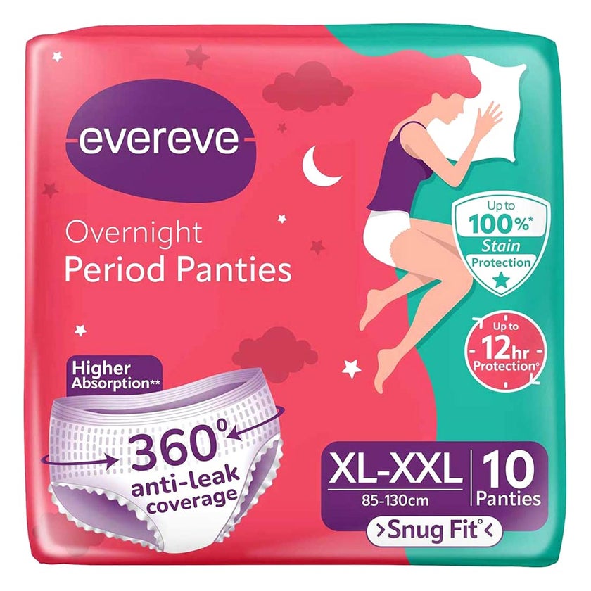 Evereve Overnight Period Panties in XL-XXL Size designed to provide reliable overnight protection with enhanced comfort and security. Developed with advanced Everlock Technology, these disposable period panties deliver all-round coverage that helps prevent front, back, and side leakage. The 360° protection design ensures full coverage, allowing you to rest with confidence. The core features super absorbent micro-beads that instantly lock in overflow. With 4X absorption capacity compared to standard sanitary napkins, the panties are built to manage heavy flow effectively. The high absorption system helps maintain dryness and reduces the risk of leakage, offering up to 12 hours of protection during the night.