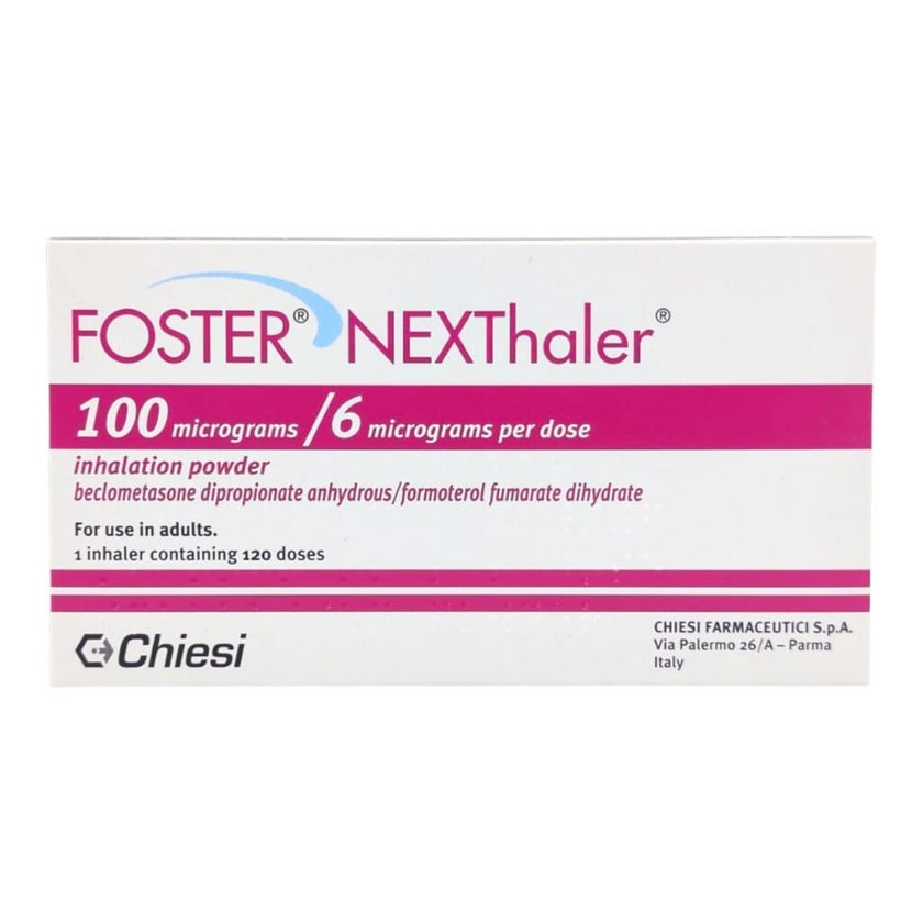 Foster NEXThaler 100 mcg/6 mcg Powder for Inhalation is a prescription dry powder inhaler (DPI) containing a combination of beclometasone dipropionate, a potent inhaled corticosteroid (ICS) and formoterol fumarate dihydrate. This fixed-dose combination inhaler is primarily indicated for the regular maintenance treatment of asthma in adults whose symptoms are not adequately controlled with corticosteroids alone or in those already stabilized on combined steroid and LABA inhalers. It may also be considered for symptomatic management of chronic obstructive pulmonary disease (COPD) in adults with significant symptoms and a history of exacerbations who remain symptomatic despite long-acting bronchodilator therapy. The NEXThaler device is breath-activated, meaning the medication is released as the patient inhales deeply through the mouthpiece, allowing the powdered medication to reach deep into the lungs with each dose. Regular, daily use as prescribed typically one or two inhalations twice daily for asthma, with dose adjustment based on symptom control helps maintain steadier airflow, reduces shortness of breath, wheezing and coughing, and supports overall respiratory function.