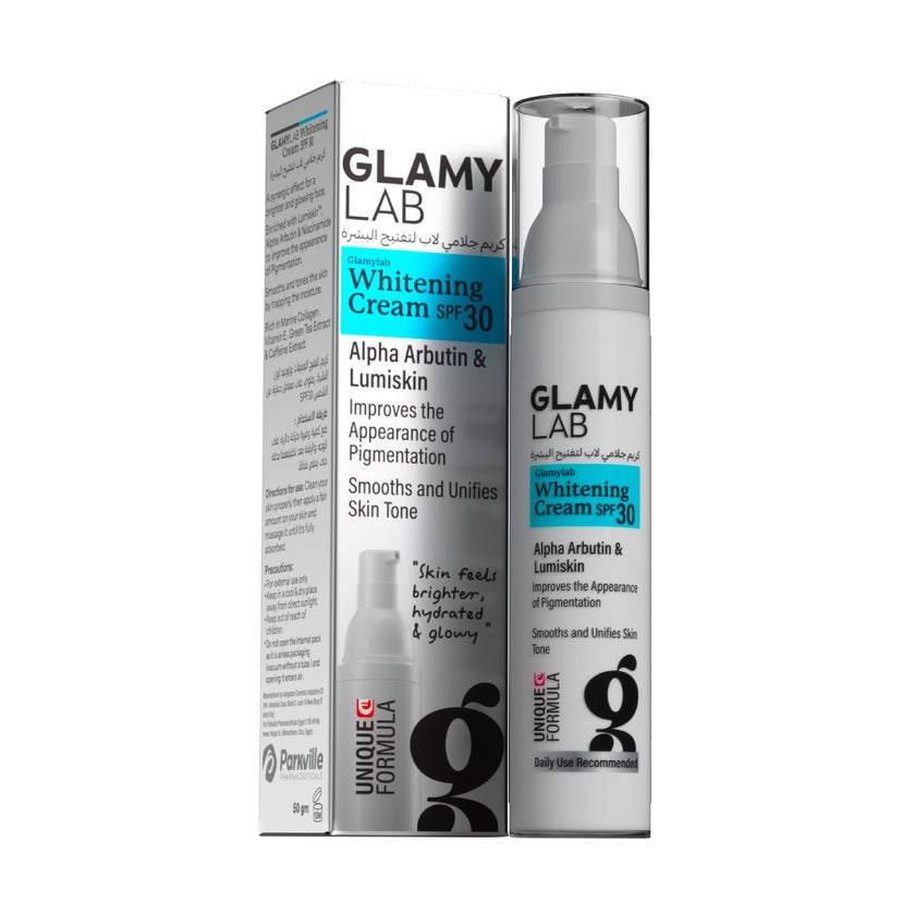 Glamy Lab SPF 30 Whitening Cream for Dark Spots and Pigmentation is an advanced brightening treatment designed to target uneven skin tone dark spots and post acne marks while protecting the skin from sun damage. This multi action formula combines effective brightening ingredients such as alpha arbutin and Lumiskin to help reduce the appearance of pigmentation and promote a clearer more radiant complexion. It works to improve skin clarity while supporting a more even tone and smoother texture over time. Enriched with marine elastin the formula helps enhance skin elasticity and softness while improving overall skin structure. The addition of SPF 30 provides essential daily protection against harmful UV rays which are a major cause of pigmentation and uneven skin tone. The lightweight texture absorbs easily into the skin without heaviness making it suitable for daily use. With consistent application it helps brighten the skin reduce visible discoloration and maintain a healthier more balanced and glowing complexion.