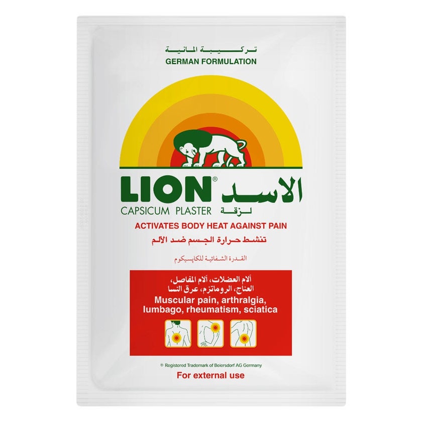 Lion Capsicum Plaster acts directly on areas of pain by activating body heat for immediate relief. Heat from the patch relieves muscle tension, promotes relaxation and restores mobility. Use Lion Capsicum Plaster for symptomatic treatment of: muscular tension and strain, stiff neck, aching shoulders, myalgia (stiff muscles), lumbago, backache, rheumatism, sciatica, neuralgia. Plaster should be worn until the pleasant heat effect ceases – usually after two days.