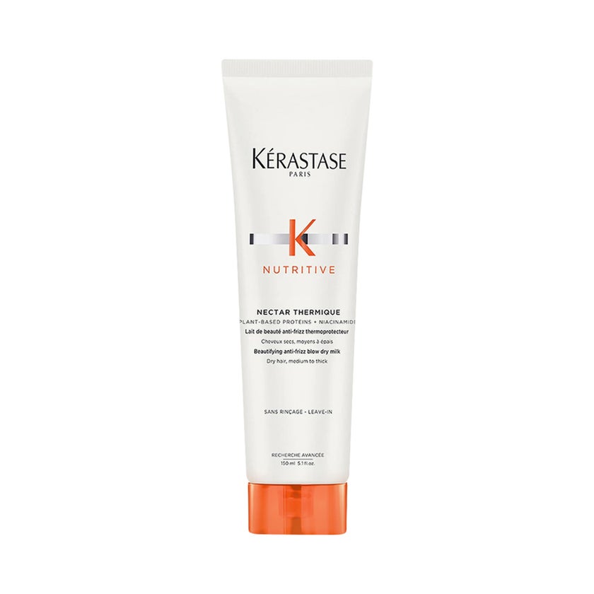 Kerastase Nutritive Nectar Thermique Hair Cream, a professional leave-in treatment designed to defend against heat damage while delivering deep hydration and smoothness. This beautifying anti-frizz blow-dry milk is specially formulated for medium to thick dry hair, helping to restore softness, shine, and manageability during styling. The formula is powered by plant-based proteins (derived from wheat, corn, and soy), which act as essential nutrients to strengthen the hair fiber and improve resilience. These proteins help replenish lost nutrients, reinforcing weakened strands and improving overall hair structure. It also contains niacinamide (Vitamin B3), known for its ability to lock in moisture and strengthen the hair barrier, ensuring long-lasting hydration and protection against dryness. Complementing this are anti-dryness polymers and coating agents, which smooth the hair surface, reduce frizz, and create a protective layer that shields hair from humidity and environmental stress. This advanced formula offers thermal protection up to 230°C, making it ideal for use with blow dryers and styling tools, while significantly reducing frizz and breakage. With its lightweight creamy texture, it detangles effortlessly and leaves hair soft, shiny, and easy to style, delivering salon-quality results at home.