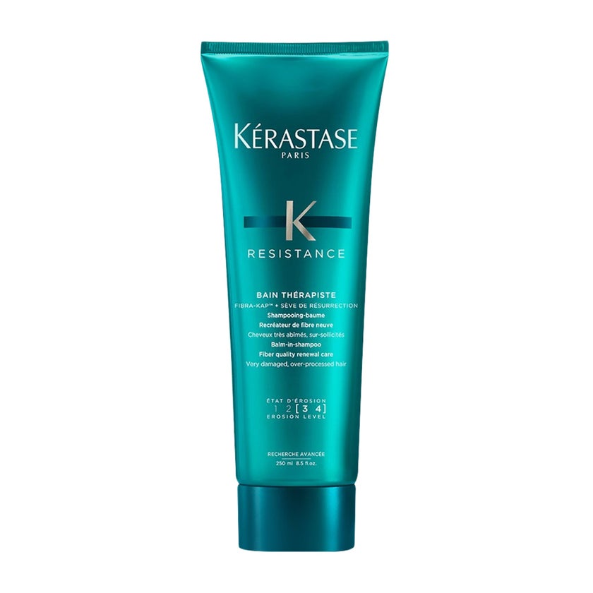Kerastase Resistance Bain Therapiste Balm-In-Shampoo, an advanced repairing cleanser specifically developed for over-processed and weakened hair fibers. This innovative formula features a unique jellified balm texture that envelops the hair during cleansing, reducing friction while gently repairing the fiber from within. At the core of the formula is the FIBRA-KAP™ complex, designed to compensate for missing keratin-associated proteins (KAPs) and stimulate their synthesis, helping rebuild the internal structure of the hair. This is combined with a blend of 6 amino acids (including arginine, serine, and glutamic acid), which act as essential building blocks to strengthen and reinforce weakened strands. The formula also includes hydrolyzed wheat protein, which helps improve elasticity and resilience, and resurrection plant sap (Myrothamnus flabellifolia extract), known for its powerful regenerating properties that revive and smooth damaged hair. Additionally, glycerin works as a humectant to retain moisture within the hair fiber, ensuring hydration and softness. This combination of advanced ingredients allows the shampoo to not only cleanse but also repair past damage while protecting hair from future stress, leaving it smoother, shinier, and more resilient after every wash.