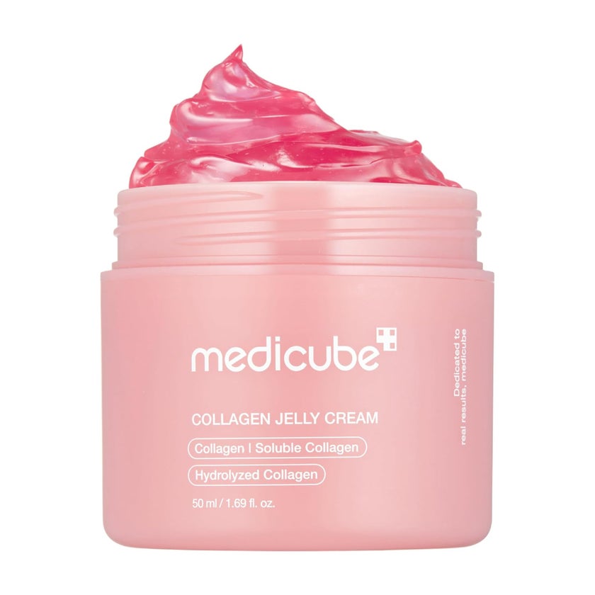 Medicube Collagen Jelly Face Cream is a hydrating and firming cream enriched with collagen, soluble collagen and hydrolyzed collagen to improve skin elasticity and reduce the appearance of fine lines and wrinkles. It contains niacinamide (vitamin B3) boosts skin's barrier function, freeze-dried hydrolyzed collagen that helps to improve firmness and elasticity, squalane prevents moisture loss and become more flexible. Hydrolyzed collagen promotes soft, hydrated appearance. The unique jelly texture offers a refreshing sensation while deeply nourishing the skin. This cream helps enhance skin texture and smoothness, leaving the skin feeling soft, plump, and revitalized. It also provides long-lasting hydration without leaving a greasy residue, making it ideal for daily use. Dermatologically tested and suitable for all skin types, this cream is perfect for anyone looking to boost their skin's firmness and youthful glow.