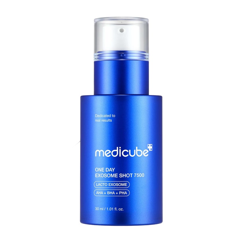 Medicube One Day Exosome Shot Pore Ampoule 7500 Facial Serum is an advanced skincare solution designed to visibly refine pores, improve skin elasticity, and enhance overall skin texture. Made of Lacto exosome, a patented active ingredient in Medicube, effectively cares for damaged skin, providing vitality and energy Comprised of various active ingredients including peptides, amino acids, glutathione, and vitamins, Medicube's patented Exosome addresses daily skin concerns and promotes natural skin health. By encouraging faster skin turnover and repair, they help reduce the appearance of enlarged pores and sagging skin. It also includes peptides that support collagen and elastin synthesis, enhancing firmness and smoothness. To further elevate hydration, collagen and hyaluronic acid are included to plump the skin and reduce the appearance of fine lines, making the complexion look fuller and more radiant. The ampoule's texture is lightweight, fast-absorbing, and non-sticky perfect for daily use and layering within any skincare routine. A mild tingling sensation may be felt upon application, mimicking the effect of microneedling, which encourages deeper ingredient absorption without invasive procedures. Clinically tested, the formula is hypoallergenic, non-comedogenic, and free from artificial dyes, gluten, and harsh irritants, making it suitable for all skin types, including sensitive skin.