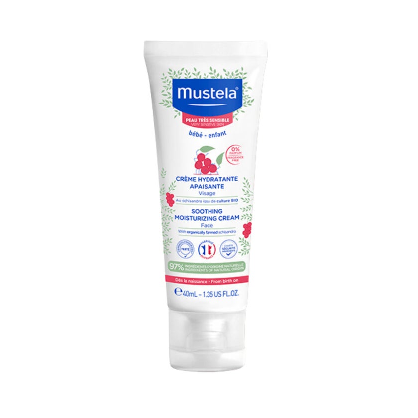 Mustela Soothing Moisturising Face Cream provides an immediate, long-lasting moisturizing effect on baby skin. It soothes to improve the appearance and sensations of tingling and tightness associated with very sensitive skin.