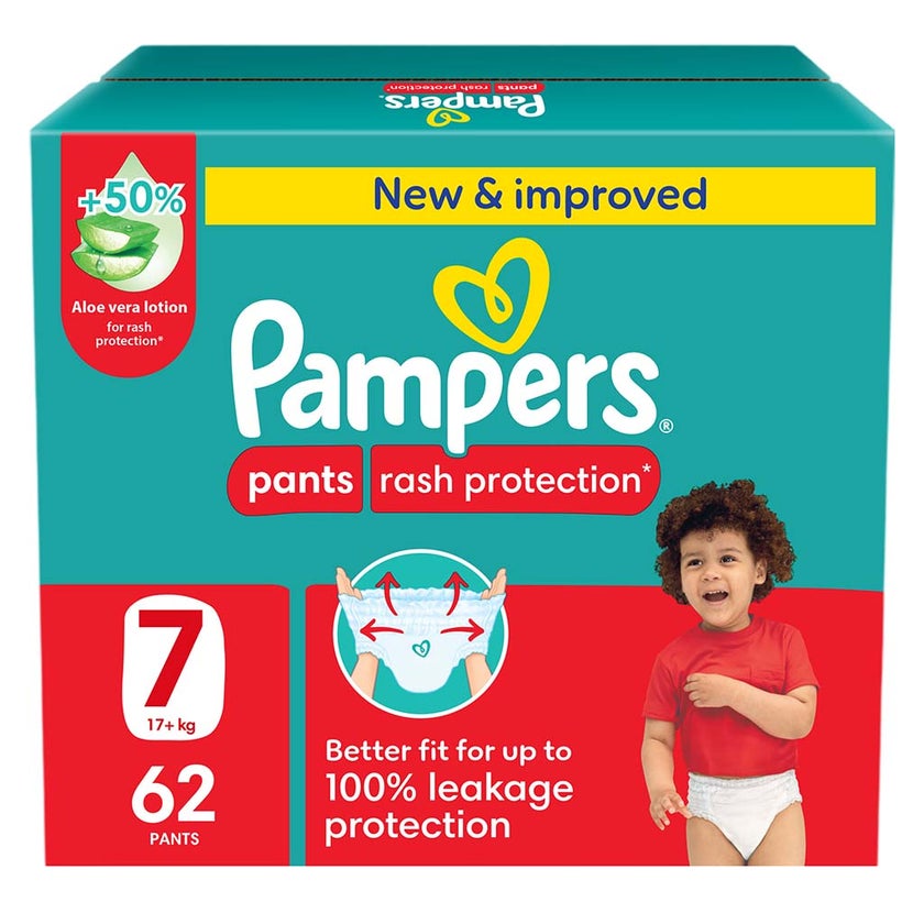 Pampers Rash Protection baby diaper pants is the new and upgraded version of the Pampers Baby Dry crafted to shield against diaper rashes. With +50% Aloe vera lotion creating a protective moisture barrier to keep your little one’s skin well-soothed and protected against diaper rashes, these Pampers pants are constructed to ensure maximum protection for your baby’s little movements. With a longer core and double leak guards, these baby pant diapers absorb maximum leakage for long-lasting dryness and protection. The diaper pants’ back sheet with newer designs not only inspires joy but also acts as an additional layer to help keep wetness away. Pampers diapers are recognized and admired globally for skin health and safety compliance.