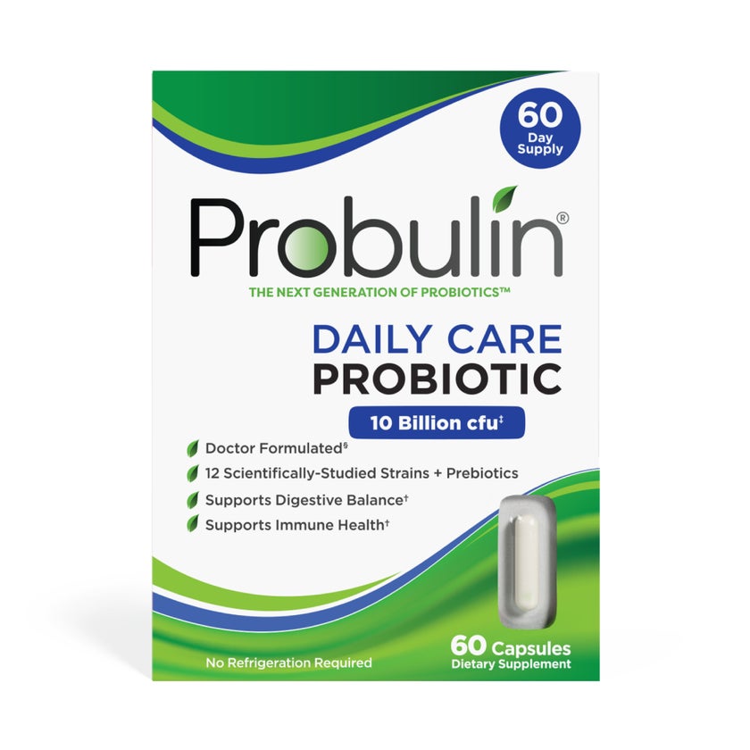 Probulin Daily Care Probiotic Capsules For Digestive Health is a balanced, once daily Probiotic + Prebiotic. The Daily Care Probiotic is precisely what you need if you're looking for daily gut-health maintenance and support. When it comes to probiotics, more isn't always better. When delivered properly, anything more than 10 to 20 billion CFU (colony forming units) may be unnecessary. With the Daily Care Probiotic, you'll have peace of mind that you're consuming a 12-strain probiotic blend with 10-billion CFU that always delivers properly hydrated and activated probiotics when the time is right, thanks to Probulin's MAKTrek 3-D Probiotic Delivery System. The probiotics are housed in a "seaweed submarine" that provides an extra barrier to keep them dry and protected from stomach acid and bile. If you're looking to add a daily probiotic to your routine that supports gut health, the Daily Care Probiotic is the way to go. Probulin products are designed from scientifically documented strains of living probiotic beneficial bacteria. All of Probulin formulations are based on well-documented scientific research. As a result, Probulin proudly deliver safe, effective probiotics backed by science.