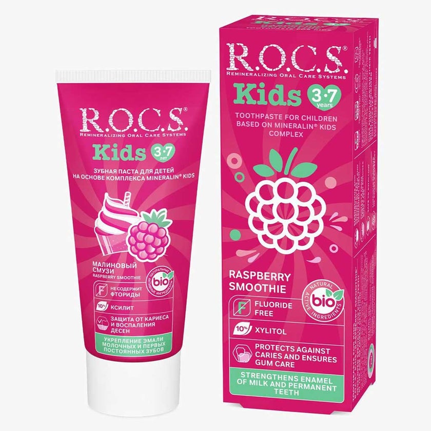 ROCS Raspberry Smoothie Toothpaste ROCS Kids 3-7 Years Raspberry Smoothie Toothpaste 35ml is carefully formulated to meet the unique oral care needs of young children aged three to seven. This toothpaste offers a gentle yet effective cleaning experience designed to protect developing teeth without the risks associated with fluoride ingestion. Its composition is particularly safe for kids who often swallow toothpaste during brushing, providing peace of mind to parents. The delightful raspberry smoothie flavor enhances the brushing routine, making it a fun and appealing experience for kids who might otherwise resist oral hygiene practices. This flavor encourages consistent brushing habits, which are vital for maintaining healthy teeth and gums from an early age. It also excludes sulfates and harsh chemicals, which can cause irritation in sensitive young mouths, making it suitable even for children prone to allergies. The toothpaste features a low-abrasion formula that protects dental tissues while effectively removing plaque and debris. It contains a special Mineral complex with high concentrations of xylitol, a natural sugar alcohol known for its powerful anticaries properties that inhibit harmful bacteria. Additionally, bioavailable minerals such as calcium glycerophosphate and magnesium chloride supply essential calcium, phosphorus, and magnesium needed for strengthening and remineralizing enamel. These elements support the natural development of durable, healthy teeth by replenishing mineral content lost to acids and decay.This toothpaste also possesses prebiotic properties, normalizing the oral microbial environment and helping to maintain balanced, healthy oral flora during times of oral dysbiosis. The combination of clinically tested ingredients ensures protection against caries and inflammation.In sum, ROCS Kids Raspberry Smoothie Toothpaste delivers a comprehensive oral care solution combining safety, efficacy, enjoyable taste, and ethical formulation that supports early dental care education and healthy habits for children aged 3 to 7 years.