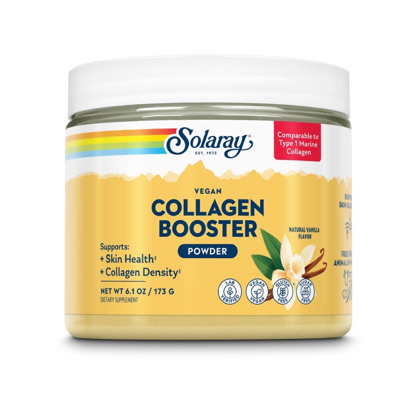 Solaray Vegan Collagen Booster Powder is a plant-based alternative to traditional collagen supplements, offering powerful support for skin, hair, nails, and joints without any animal-derived ingredients. Formulated with VeCollal, a biomimetic amino acid blend comparable to human Type 1 collagen, it helps stimulate natural collagen production in the body. Enriched with Vitamin C, Centella Asiatica, and Panax Ginseng, this formula promotes skin elasticity, hydration, and firmness while supporting joint and connective tissue health. Its natural vanilla flavor makes it easy to mix into water, smoothies, or your favorite beverage. Perfect for vegans, vegetarians, or anyone seeking a clean collagen alternative, Solaray Vegan Collagen Booster helps fight visible signs of aging, minimize wrinkles, and restore youthful radiance.