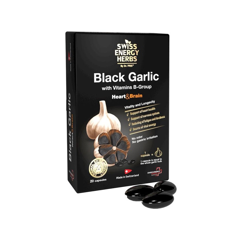 Swiss Energy Black Garlic Capsule contains high-quality special black garlic extract supplemented with valuable B vitamins that help maintain vital body functions such as heart function, iron metabolism, nervous system, mental functions and energy metabolism, and to reduce fatigue and tiredness. The black garlic used to produce the extract is a special Argentine garlic that specialists naturally ferment in Japan through the application of a centuries-old and complex process. During the natural fermentation process (without genetic engineering) fresh garlic is aged (fermented) under controlled conditions for a long period of time. Sugar and amino acids of garlic produce melanoidins during fermentation, yellow brown to almost black, natural organic compounds that are responsible for black color. Due to fermentation, garlic gets a very soft consistency. Swiss Energy Black Garlic Capsules are small soft capsules and pleasant to swallow, they do not cause any unpleasant odors or belching.