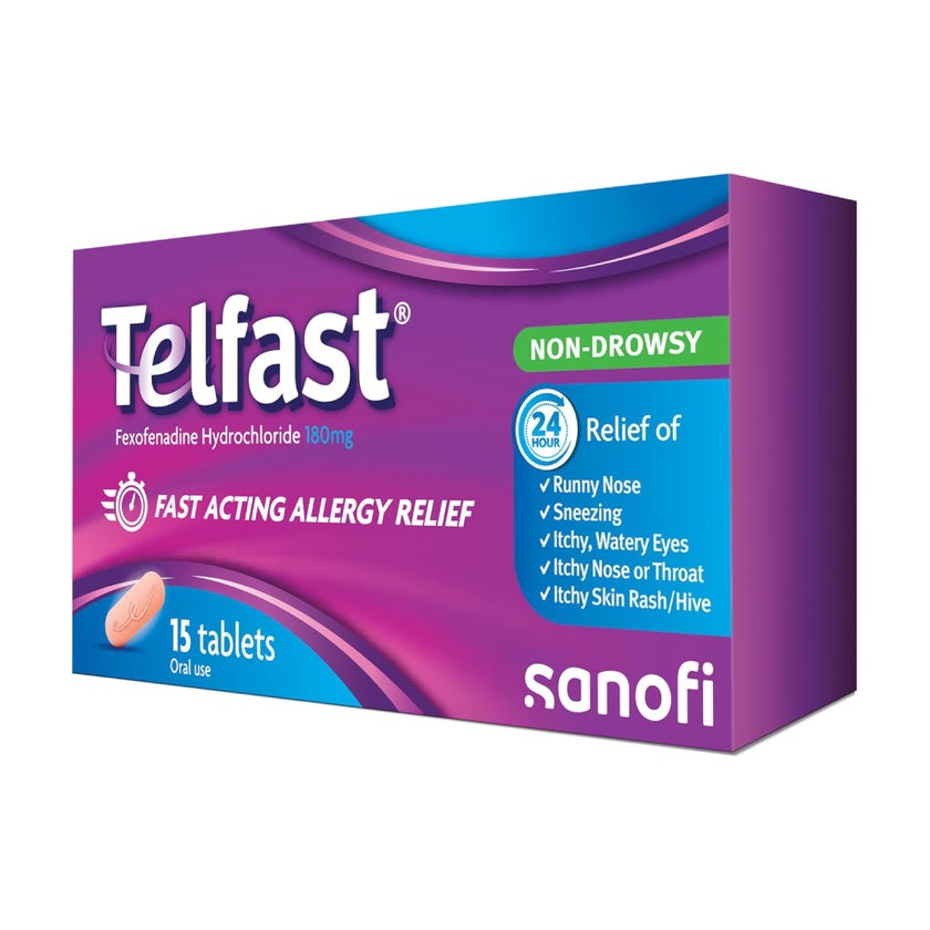 Telfast is an anti-histamine that provides fast, non-drowsy relief from the symptoms of seasonal allergic rhinitis (hay fever) in adults and children over 12 years old. It helps in treating itchy skin, rashes or hives with a trusted formulation of Fexofenadine hydrochloride, a second generation anti-histamine that relieves allergy symptoms without causing drowsiness to keep you focused when you need it the most. With just one tablet a day you can get on with your life without worrying about your allergies.