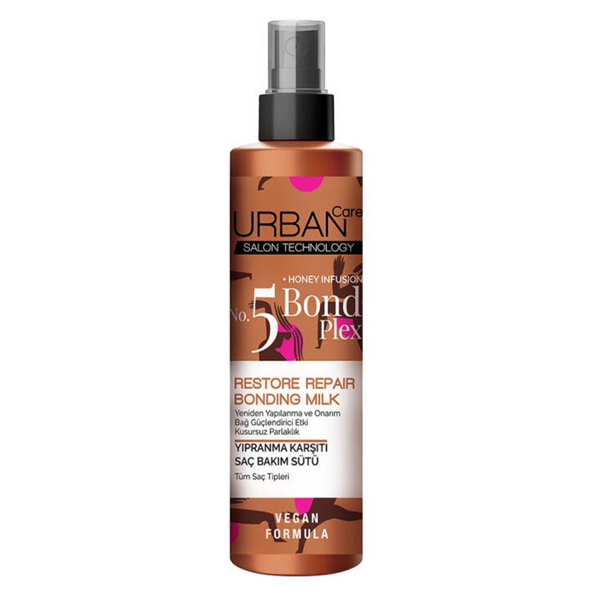 Urban Care Honey Infusion No.5 Bond Plex Restore Repair Bonding Milk Hair Spray is expertly developed with bond strengthening formula supported by honey content that moisturizes hair strands and combats hair damage and frizziness. It hydrates the hair without weighing down and helps to repair damage by penetrating hair strands. Formulated with bond strengthening content and honey. Honey has both emollient and humectant properties, making it a great hair moisturizer. Emollients smooth the hair follicles, adding shine to dull hair. Humectants bond with water molecules, adding moisture to dry strands. By moisturizing and locking in shine, it can help restore the natural luster of your hair. When the open bonds in the hair are closed with the bond-strengthening content of the Bond Plex series, it retains moisture and the nourishing effect of the Honey content and helps the hair to be moisturized, look soft and shiny, and prevent color fading in the hair. With its special bond-strengthening technology, it strengthens excessively damaged hair strands and extends the life of hair prone to breakage. It increases hair elasticity, heals split ends thanks to its nourishing effect and protects them before heat and chemical processes. Hair bonds are strengthened and protected against chemical processes such as high-heat styling, dyeing, and damage caused by environmental factors, and it has a stronger structure. Urban Care Urban Care Honey Infusion No.5 Bond Plex Restore Repair Bonding Milk Hair Spray is an innovative approach to hair repair and its ability to significantly improve the condition of damaged hair. It contains no paraben, silicone or sulfates and it is vegan, and cruelty free formula packed in a recyclable packaging.