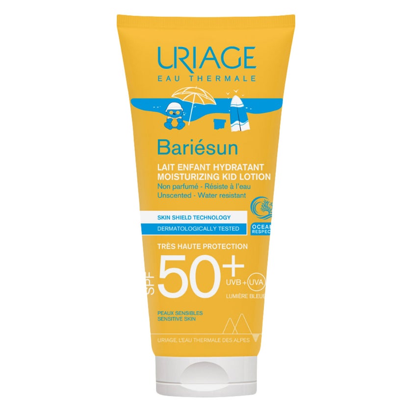 Uriage Bariesun SPF 50+ Moisturizing Lotion is indented to provide a very high level of sun protection and is recommended for use on children's face and body skin. This sunscreen essentially has a high-performance filtering compound added to it that shields the skin from UVA and UVB radiation. In addition, even after spending all day at the beach or pool, the skin is shielded from free radicals and keeps its moisture longer. Because it contains neither alcohol nor fragrance, its formulation is gentle enough to use on skin that is sensitive. At the same time, it has a thin, non-greasy texture that absorbs swiftly into the skin, enabling them to resume their outdoor activities right away. The renowned moisturizer uriage thermal water has been included to the mix of this sunscreen as well. In essence, it defends the skin's DNA from UV ray damage and strengthens the skin's protective barrier to combat the sun's detrimental effects. Additionally, because it contains Aquaspongines, this lotion offers strong protection against dryness. As a result, the skin is significantly smoother, softer, and more moisturized in addition to being completely protected from the sun. The presence of vitamin C and E guarantee extra protection to the skin thanks to the high concentration of antioxidants. Anti-UVA-UVB Filtering Complex with Tinosorb M guarantees proven photostability and broad UVB and UVA coverage. Overall, children's skin receives complete sun protection, maintaining its moisture and smoothness all day long.