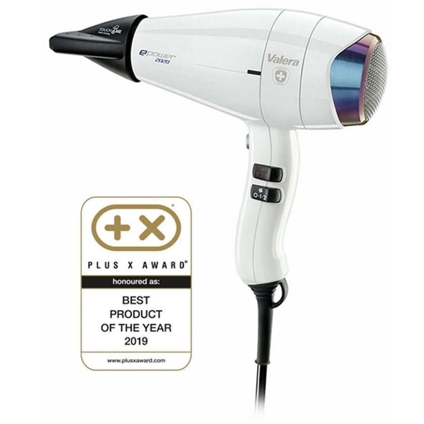 Valera E-Power 1600W Hair Dryer is a high performance hair dryer with brushless digital motor, Ions generator that produces millions of purifying negative ions, Smart air flow technology, Superflex 3 m cable with Rotocord, 2 professional ultra slim concentrator nozzles, TOUCH ME COOL, Diffuser and pouch, + 32% energy efficient, 25% energy consumption, + 26% hair drying power and + 29% air production.