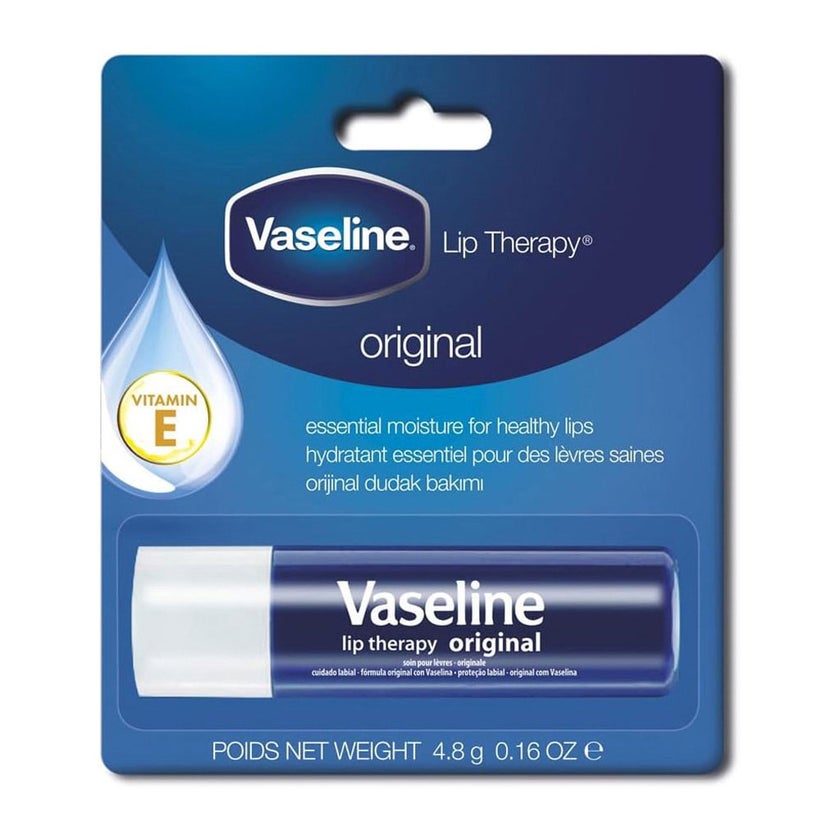 Vaseline Original Lip Therapy Lip Balm is a classic lip care stick essential designed to deliver deep moisture and protection for dry, chapped lips. Formulated with Vaseline Jelly and enriched with vitamin E, this balm supports the lips' natural recovery process by locking in hydration and helping to soothe irritation. Its compact stick format makes it perfect for daily use on the go, enabling consistent nourishment and defense against dryness caused by environmental factors like cold weather and wind. Petroleum jelly, the key ingredient in this balm, forms an occlusive barrier on the lips that prevents moisture loss and helps skin retain hydration. This protective layer not only comforts already dry lips but also helps prevent future dryness, making this lip care balm a reliable choice for everyday protection. Added vitamin E supports gentle care by conditioning the delicate skin on the lips and enhancing smoothness and softness. The fragrance‑free and smooth texture glides on comfortably without feeling heavy or greasy. Ideal for all skin types, including sensitive lips, Vaseline Original Lip Care Balm is made with a minimalistic formulation to focus on essential hydration and barrier support. It can be used as part of a daily beauty routine or whenever lips feel dry, cracked, or uncomfortable. The subtle natural finish complements bare lips or can be used as a hydrating base under lip color for additional comfort. Thanks to its compact design, it fits easily into pockets, purses, or travel kits for reapplication whenever needed.
