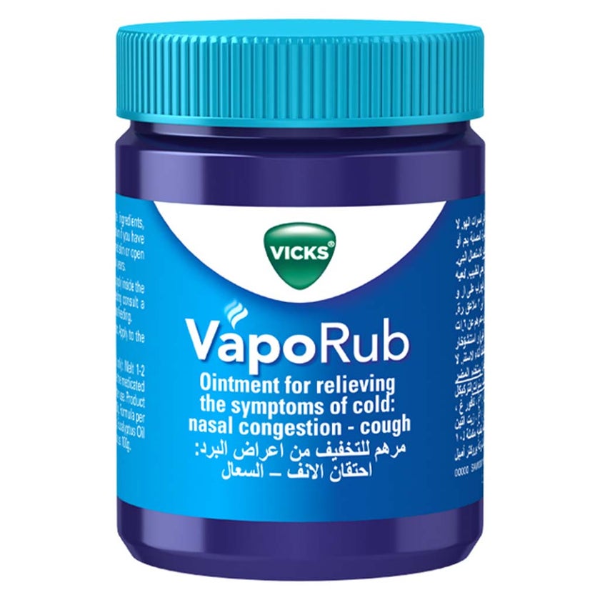 Vicks VapoRub Decongestant Ointment For Cold Relief is a topical cough suppressant medicine with medicated vapors. It starts working quickly for adults as well to relieve cough symptoms. It relieves 4 cough and cold symptoms with its unique and time-trusted formula, so you and your family can sleep and dream happily. Applying on chest and throat, temporarily relieves cough due to minor throat and bronchial irritation associated with the common cold. Vicks VapoRub contains medicated vapors that enter the nose and mouth. The powerful long-lasting vapors start working in minutes to soothe coughs for easier breathing. It also temporarily relieves minor aches and pains of muscles and joints. The active ingredients in Vicks VapoRub are camphor (a cough suppressant and topical analgesic), eucalyptus oil (a cough suppressant) and menthol (a cough suppressant and topical analgesic). The inactive ingredients in Vicks VapoRub include cedar leaf oil, nutmeg oil, petrolatum, thymol and turpentine oil. Vicks VapoRub is a popular over-the-counter (OTC) medication. Menthol provides a great treatment option for cough due to the common cold. It interacts with cold receptors in the nose and throat, helping to stop coughing. Vicks VapoRub contains 2.6% menthol to help stop constant coughing fast. The menthol and camphor in VapoRub work as topical analgesics, which means they can relieve minor aches and pains of the musculoskeletal system through the skin. Although Vicks products cannot cure a cough, they can help stop constant coughing.