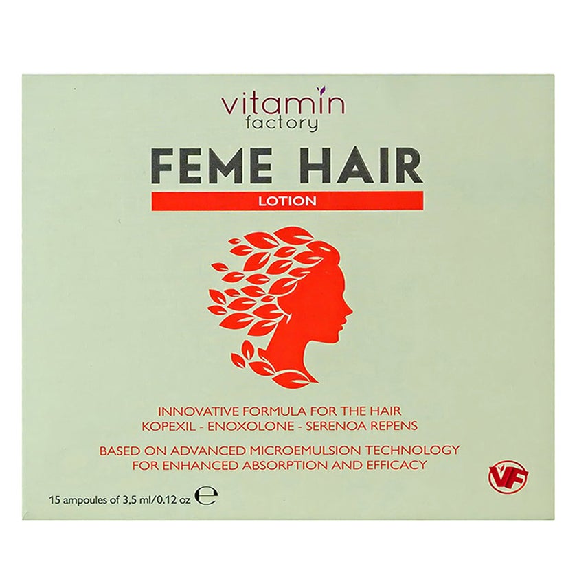 Vitamin Factory Feme Hair Lotion Ampoule is an advanced scalp care treatment created for weak, brittle, and thinning hair that requires focused support. Developed with innovative micro-emulsion technology, this lightweight lotion is designed to enhance ingredient absorption and maximize overall performance. The fine emulsion texture allows active components to distribute evenly across the scalp, forming a breathable protective layer that delivers moisturizing, nourishing, and conditioning benefits. With a refreshing feel and a pleasant fragrance, the formula offers a comfortable experience while helping hair appear stronger, healthier, and more resilient over time. The formula features a carefully selected blend of plant extracts known for their supportive properties. Serenoa repens and Centella asiatica work to promote a balanced scalp environment and improve the visible condition of hair. Rosemary essential oil contributes to a revitalized and refreshed scalp sensation, enhancing the overall care experience. Enoxolone is included for its soothing qualities, helping maintain scalp comfort while supporting a healthier appearance. This botanical synergy focuses on strengthening the foundation from which hair grows, encouraging improved density and vitality. To further enhance performance, the lotion is enriched with Kopexil, melatonin, and vitamin H. These targeted ingredients support the appearance and condition of both the hair shaft and the roots, reinforcing structural integrity and helping reduce the look of hair weakness. Melatonin is valued in cosmetic formulations for promoting a revitalized scalp environment, while vitamin H contributes to maintaining the natural strength and flexibility of hair fibers. These elements help hair look fuller, thicker, and more robust without creating heaviness or residue.