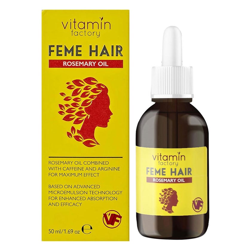 Vitamin Factory Feme Hair Rosemary Oil is a revitalizing herbal treatment created to support stronger, thicker, and healthier looking hair. This lightweight oil blends plant-based nourishment with targeted cosmetic science to deliver visible improvements in overall hair vitality. At the heart of the formula is rosemary leaf oil, derived from Rosmarinus officinalis, traditionally valued for its ability to promote a refreshed and balanced scalp environment. By helping to encourage healthy scalp circulation, this botanical ingredient supports the appearance of fuller, more resilient strands. The texture absorbs smoothly without leaving a heavy or greasy residue, making it suitable for a wide range of hair types and routines. The inclusion of caffeine enhances the performance of this formula by energizing the scalp and supporting the look of revitalized hair follicles. Widely appreciated in advanced hair care, caffeine contributes to a more stimulated scalp surface, which in turn promotes the appearance of stronger growth over time. Arginine, an amino acid naturally found in keratin, works to reinforce the hair fiber and maintain structural integrity. These active ingredients create a balanced synergy that helps reduce the appearance of hair fall and breakage while encouraging improved thickness and strength. Beyond strengthening benefits, this rosemary oil focuses on overall scalp wellness. A nourished scalp provides the ideal foundation for healthy-looking hair, and this formula is designed to enhance comfort and hydration without irritation. Free from petroleum jelly and parabens, it reflects a cleaner approach to hair care that prioritizes both performance and gentleness. The non-irritating composition makes it a dependable choice for those seeking consistent scalp support alongside cosmetic enhancement. With continued use, Vitamin Factory Feme Hair Rosemary Oil helps improve manageability, softness, and natural shine.