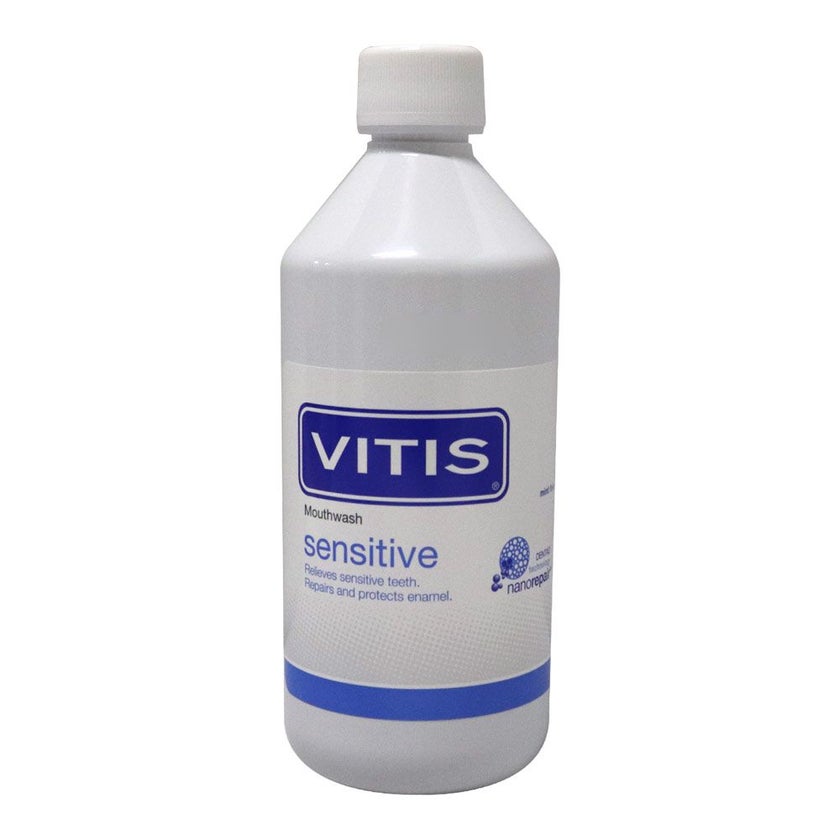 Vitis Sensitive Mouthwash has a special formula for sensitive teeth as it contains Hydroxyapatite Nanoparticles that seals dentinal tubules and repair the dentin surface, Potassium nitrate that inhibits the transmission of signals that cause discomfort, Sodium monofluorophosphate that remineralises enamel and prevents tooth decay, Provitamin B5 and Allantoin that protect gingival tissue.