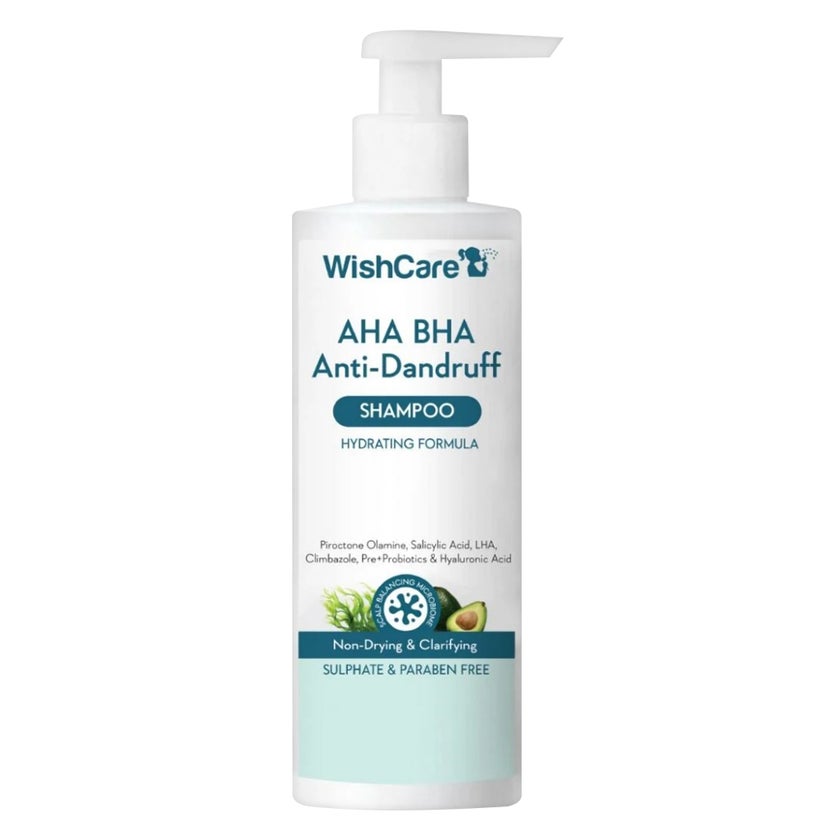 WishCare AHA BHA Anti-Dandruff Hydrating Shampoo is a targeted scalp exfoliation and dandruff-control shampoo designed to remove flakes, soothe irritation, and maintain a healthy scalp environment. The formula combines clinically proven anti-dandruff ingredients with exfoliating acids and hydrating nutrients to address the root causes of dandruff while preventing scalp dryness. The shampoo contains Piroctone Olamine and Climbazole, two powerful antifungal ingredients that help control the growth of dandruff-causing yeast on the scalp, reducing flakes, itchiness, and irritation. Salicylic Acid (BHA) works as a deep-cleansing exfoliant that penetrates scalp pores to remove excess oil, product buildup, and dead skin cells responsible for dandruff formation. To enhance exfoliation and scalp renewal, the formula includes AHA and LHA (Lipo-Hydroxy Acid) which gently loosen dead skin cells from the scalp surface. This exfoliation helps improve scalp texture, unclog follicles, and support healthier hair growth over time. The hydrating component of the shampoo features Hyaluronic Acid and D-Panthenol, which help maintain scalp moisture and prevent dryness often associated with dandruff treatments. Pre- and probiotics help balance the scalp microbiome, promoting a healthier scalp environment that supports stronger, healthier hair. With its gentle sulfate-free cleansing base, the shampoo removes impurities without stripping the scalp’s natural oils. Regular use helps keep the scalp clean, balanced, and hydrated while reducing dandruff recurrence and improving overall hair health.