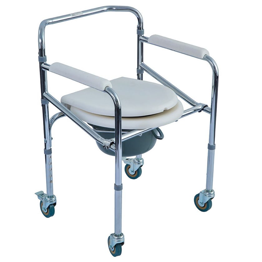 Wolaid Commode Chair is a foldable for easy storage and transfer chair with Unfolded Width 53 cm, Seat Width 42 cm, Seat Depth 43.5 cm, Seat Height 46-56 cm, Backrest, Height 33 cm, Overall Height 75-85 cm, Overall Length 51 cm, Diameter Of Wheel 3inches, Weight Cap. 100 kg and Net Weight 8 kg.