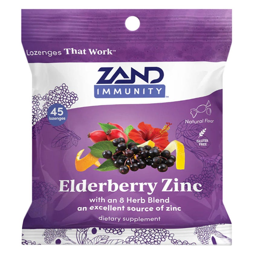 Zand Immunity Elderberry Zinc Lozenges are herbal immune support lozenges formulated with elderberry, zinc, and vitamin C to help support the body's natural defenses while soothing throat irritation. This immunity support lozenge combines botanical extracts with essential nutrients, making it ideal during seasonal changes, travel, or daily exposure to environmental stress. The pleasant-tasting lozenge slowly dissolves in the mouth, providing throat comfort while working as a convenient daily immune support supplement. Suitable for adults seeking a natural immune booster, these elderberry zinc lozenges help maintain wellness and throat comfort as part of an everyday health routine
